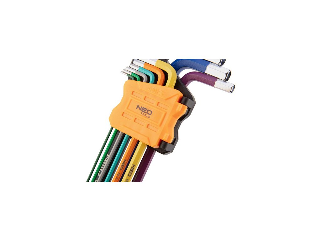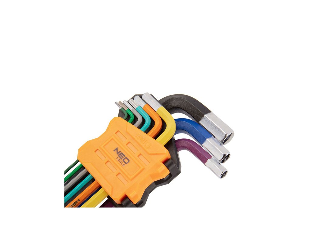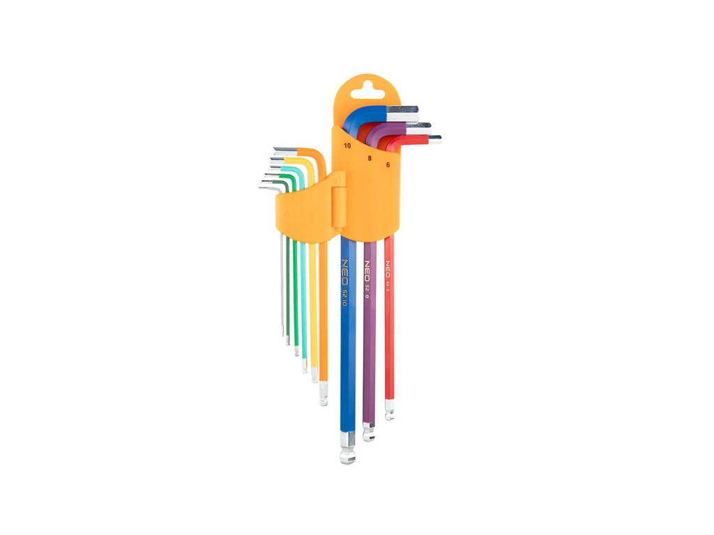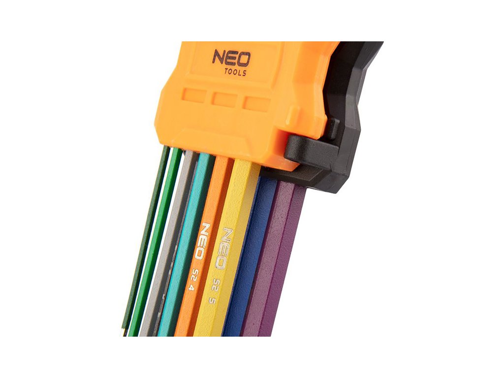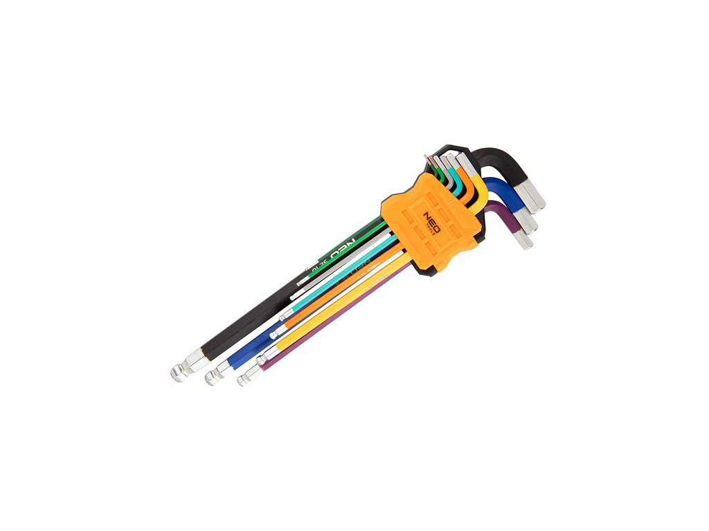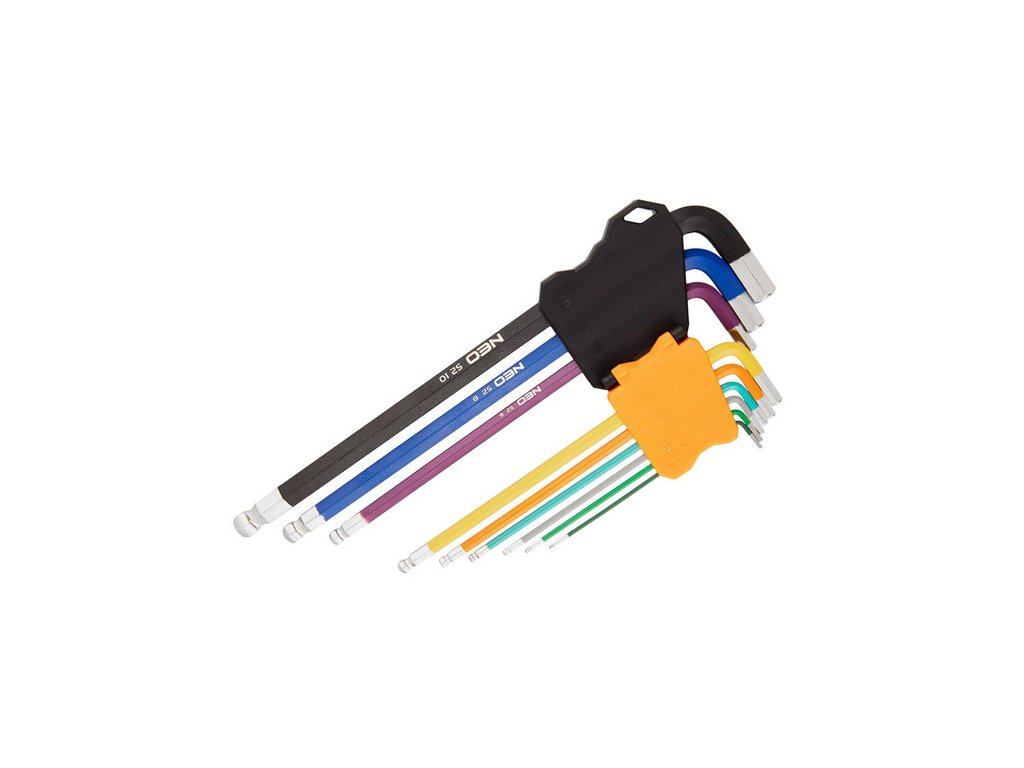Sada imbusových klíčů NEO (ref. č. 09-512) vyrobená podle DIN 911. Sada obsahuje 9 klíčů o velikosti 1,5 až 10 mm v praktickém balení. Šestihranné kuličkové konce s pracovním úhlem až 30° zlepšují funkčnost nástrojů. Barevný kód usnadňuje výběr správné velikosti. Vysoce kvalitní legovaná ocel S2 zaručuje odolnost po léta používání klíčů. Certifikát TÜV, ISO 2936 a 25letá záruka výrobce potvrzují vysokou kvalitu nářadí. Značka NEO splňuje očekávání profesionálů.