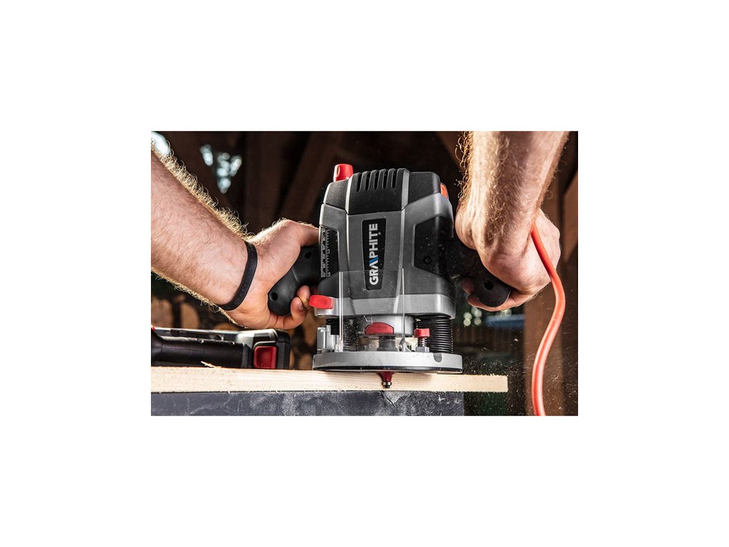 GRAPHITE frézka s výkonným 1300W motorem, určená pro frézování otvorů, drážek, hran a profilů do všech druhů dřeva a materiálů na bázi dřeva, ale i do plastů a hliníku. Zařízení má funkci regulace rychlosti a hloubky frézování. Rozsah volnoběžných otáček je od 11 000 do 28 000 min-1. Frézka má aretaci vřetena a blok hloubky frézování. Hloubku frézování lze nastavit pomocí tří nástrojů: 8stupňový koncový doraz, omezovač hloubky s plynulým nastavením (rozsah 0-55 mm) a knoflík pro přesné nastavení hloubky (přesnost 0,1 mm). Zařízení je vybaveno stabilní hliníkovou základnou s plastovým krytem, ??zajišťující snadnou manipulaci s přístrojem na všech druzích povrchů. Vodítka motoru jsou zapuštěna v hliníkovém těle s objímkami podrobenými specializované povrchové úpravě, díky které se zařízení vyznačuje zvýšenou přesností při penetraci. Ergonomické rukojeti routeru jsou potaženy protiskluzovým materiálem, takže ovládání zařízení je pohodlné a bezpečné. Protiprachový kryt a adaptér pro odsávání prachu jsou vyrobeny z průhledného polykarbonátu. Router je vybaven velkým knoflíkem pro regulaci rychlosti, umístěným v dosahu pravého palce obsluhy. Na levé rukojeti frézky je umístěna ergonomická páka bloku vedení těla, která umožňuje její ovládání, aniž byste museli sundávat ruku.Součástí stroje je: plochý klíč, vodicí pouzdro pro kopírování podle šablony, hrot pro kruhové řezání, adaptér na odsávání prachu s redukcí, tři kleštiny o průměrech 6, 8, 12 mm, hliníkové paralelní vedení vybavené speciálním plastový kryt, chránící proti poškrábání a mechanismus umožňující přesné přizpůsobení polohy frézky hraně materiálu. Nářadí je vybaveno pružným a pevným napájecím kabelem v pogumovaném provedení o délce 3 m, určený také pro profesionální a průmyslové aplikace pro použití v interiéru i exteriéru.