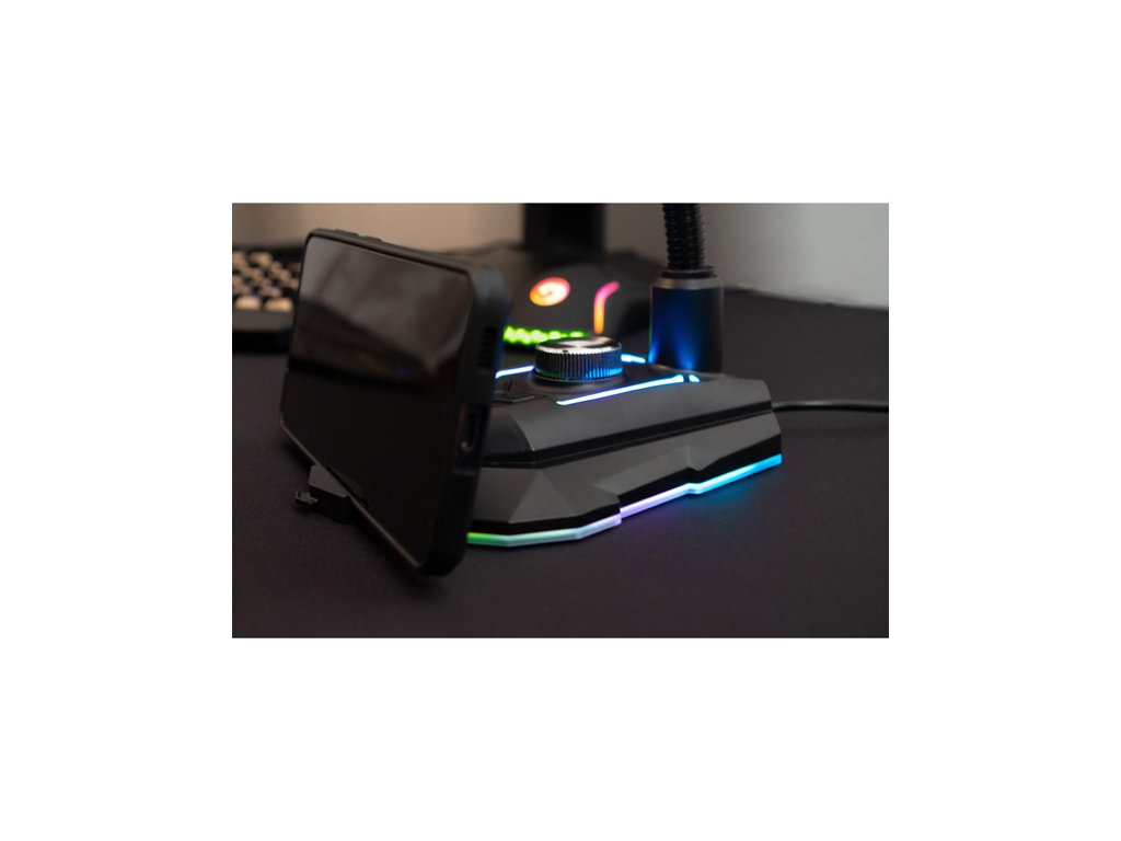 Nejlepší výbava herního místa je ta, která svítí. Mikrofon má zabudované rainbow podsvícení ve své základně, ale také na horní části kolem tlačítek pro ovládání. Během hry tak ovládací tlačítka snadno najdete.