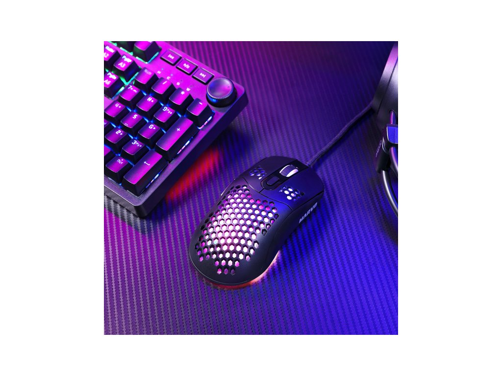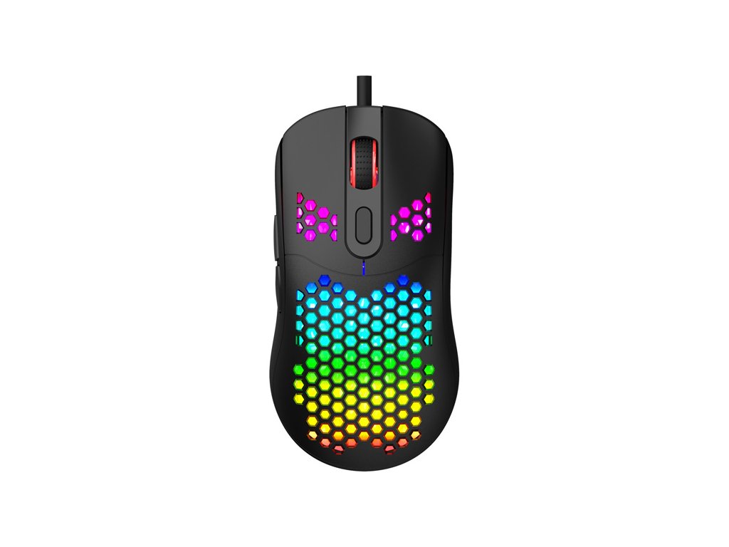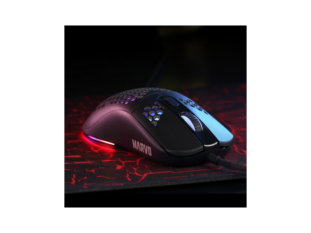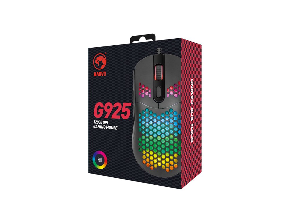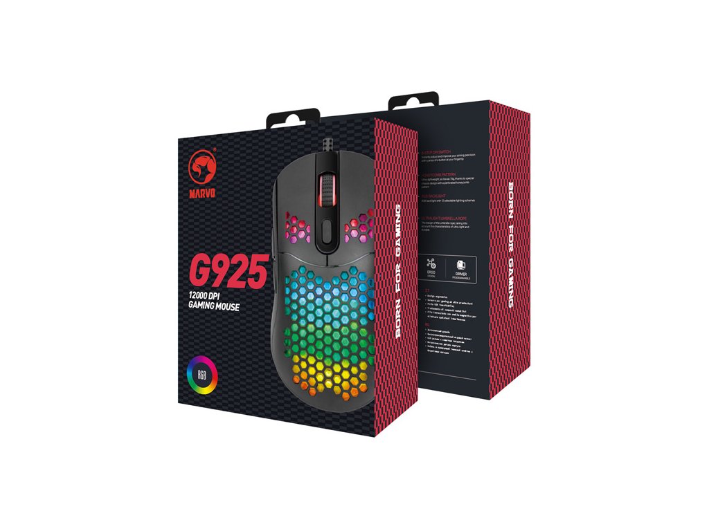Herní myš Marvo G925Optická herní myš Marvo G925 je ultralehká, díky speciálnímu perforovanému designu, který připomíná včelí plástve (Honeycomb design). Díky tomu váží pouhých 70 g a je proto snáz ovladatelná při hře. Při dlouhodobé práci a hrách, proto nebudete pociťovat únavu. Oku bude lahodit RGB podsvícení myši.