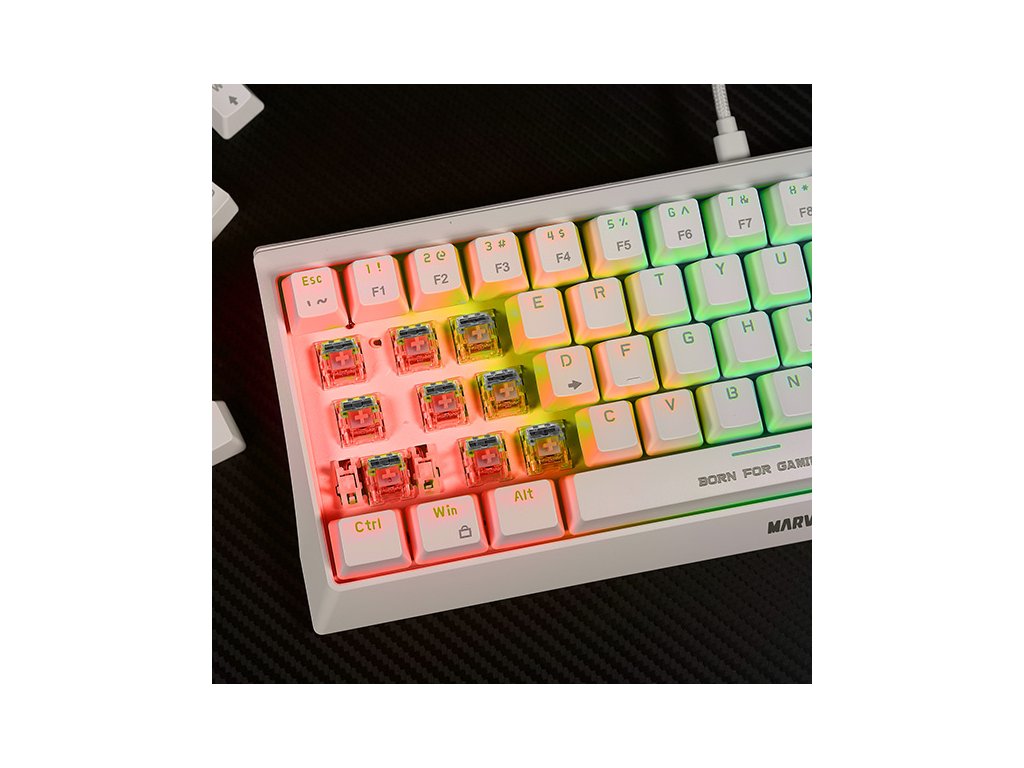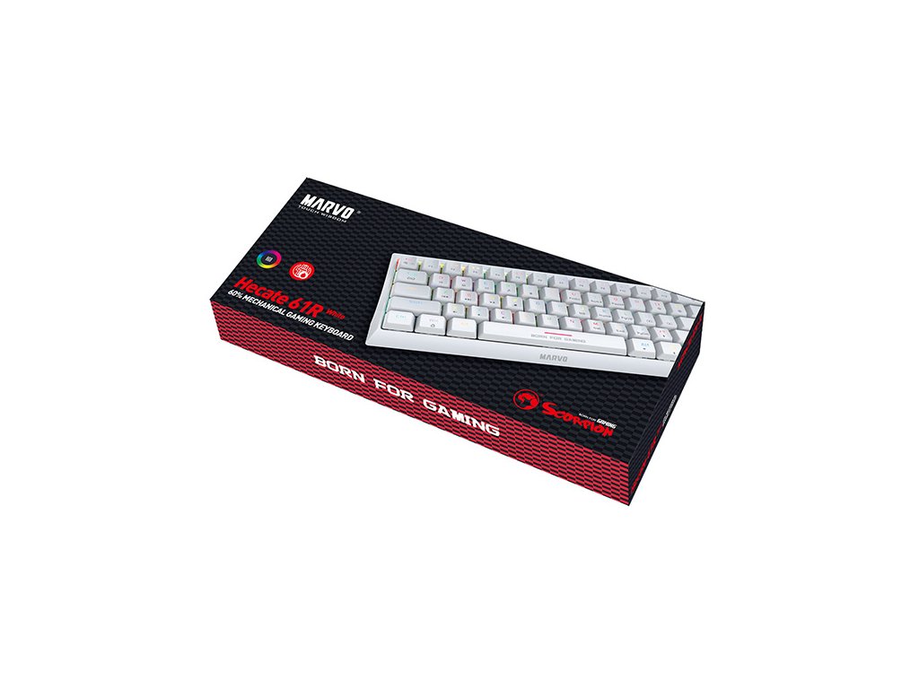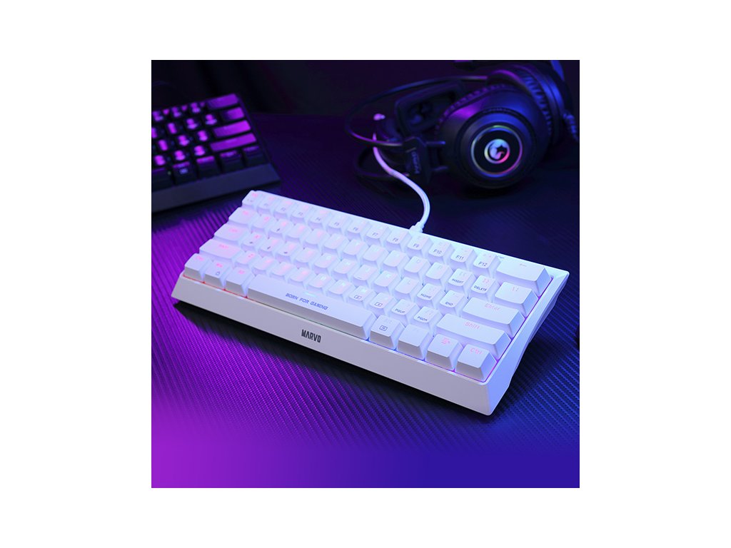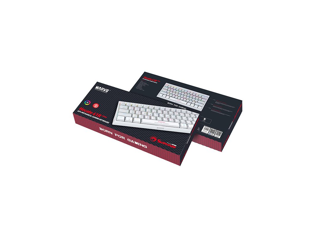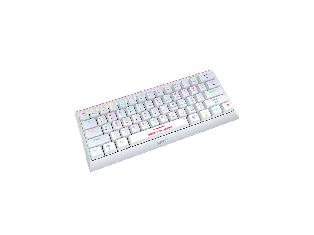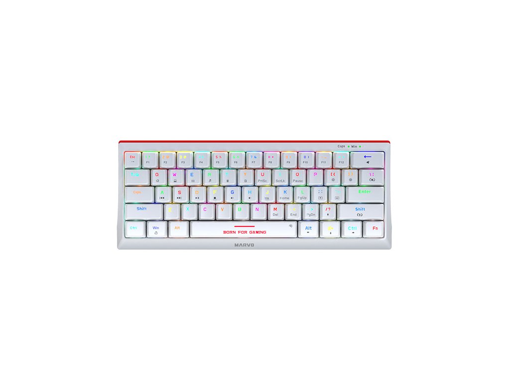 I společnost Marvo jde s dobou, a proto přinesla tuto zmenšenou krásku v bílé barvě. Tato herní klávesnice má 60% TKL design bez numerické části. Ptáte se proč? Jak gaming, tak i požadavky hráčů jsou náročnější každým dnem, někomu nevyhovuje velikost klávesnice, někdo nepotřebuje numerickou část. Tento model KG962G uspokojí jak náročné hráče, tak i přiležitostné gamery. Svou kompaktní velikostí potěší všechny ty, kteří rádi hrají u svých kamarádů a nebo klávesnici používají na více zařízeních. Absenci numerické části nahrazuje tlačítko FN, které při správné kombinaci nahradí všechny chybějící klávesy.