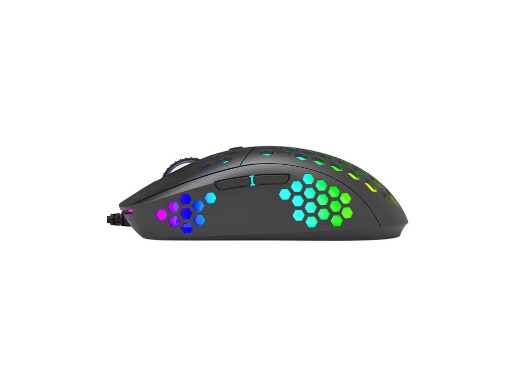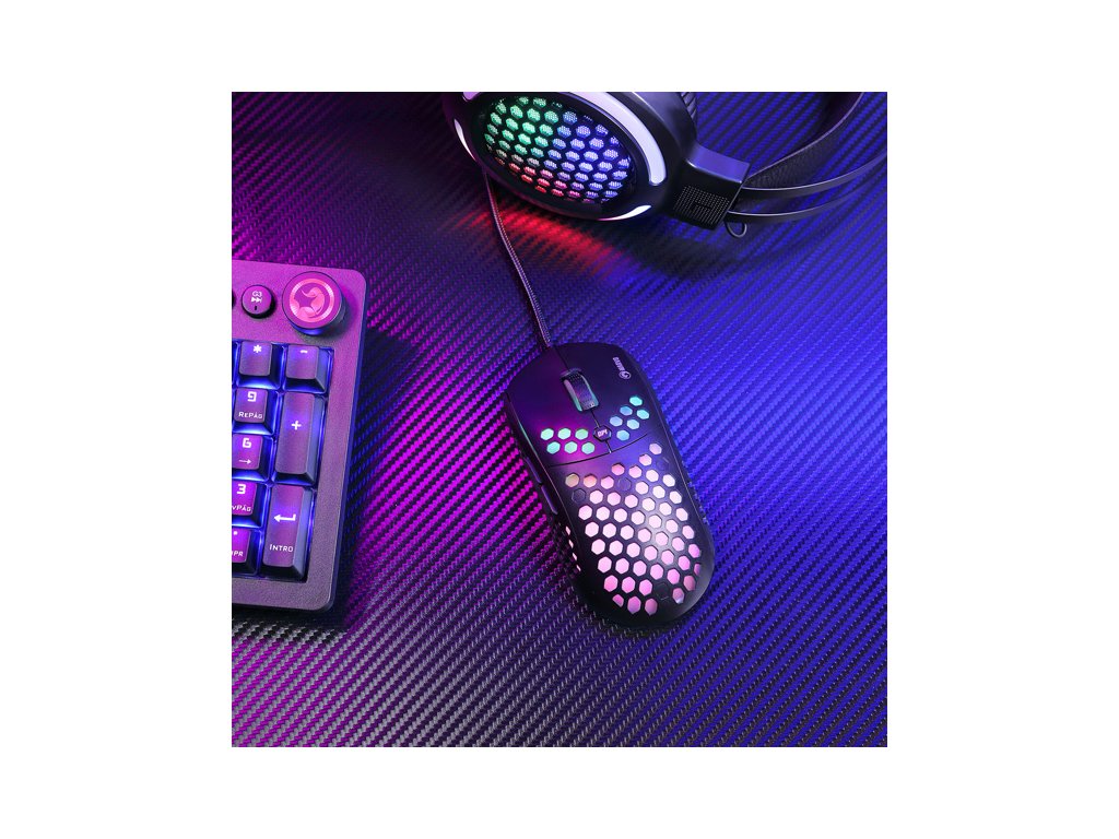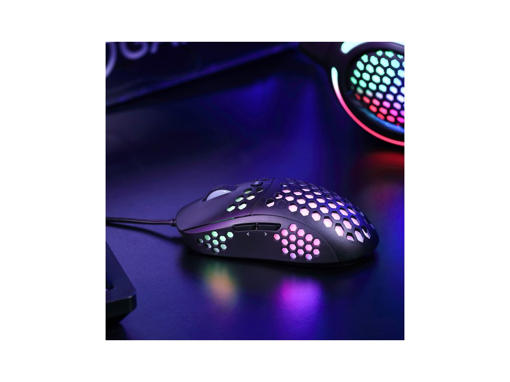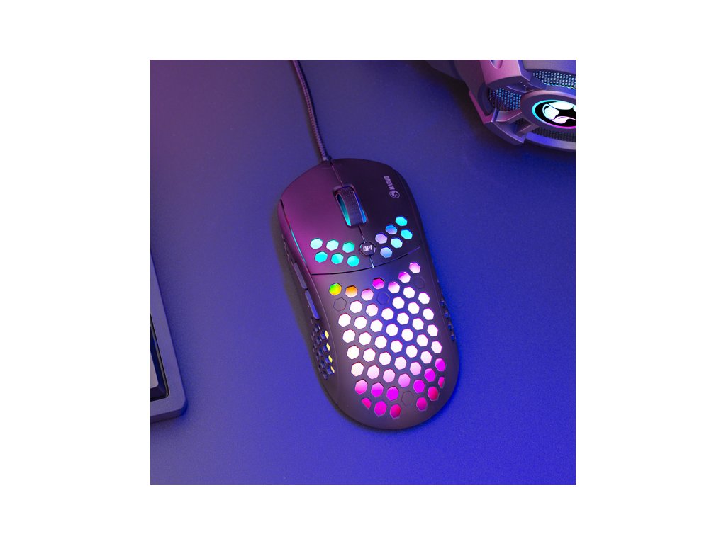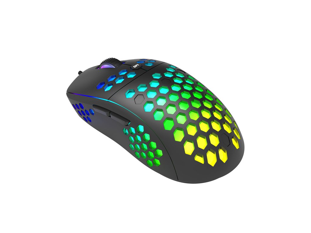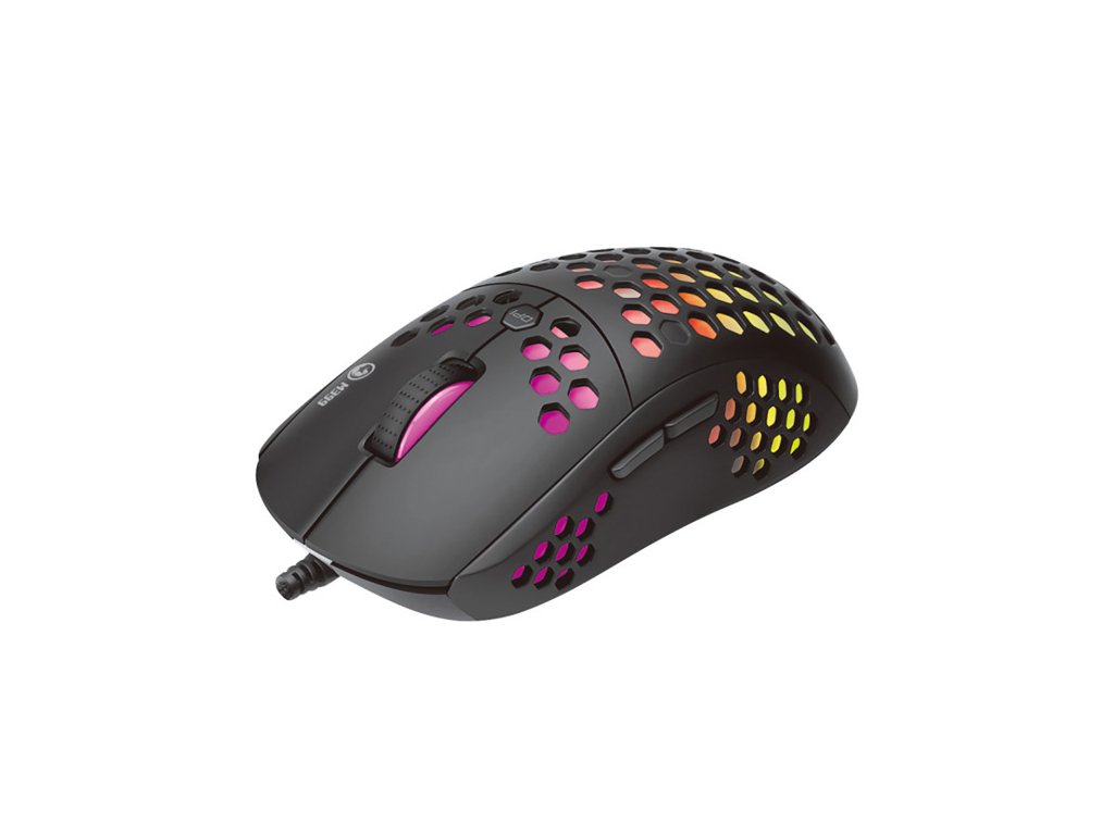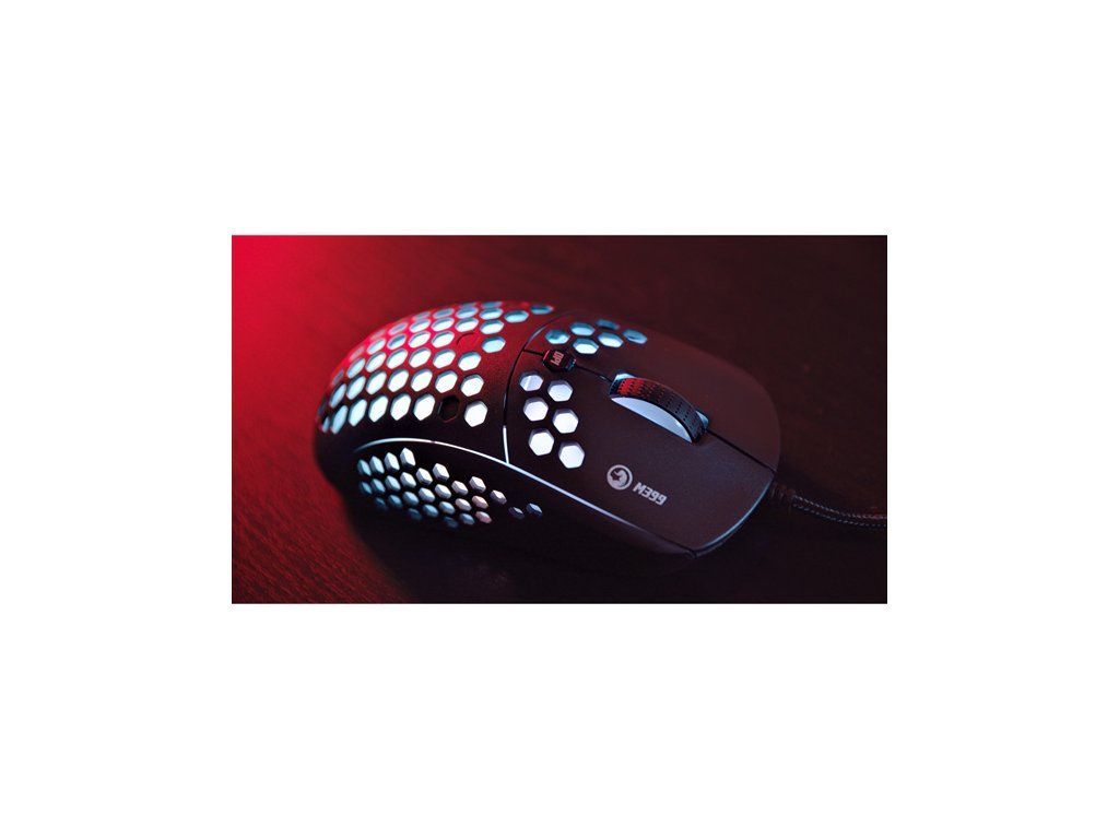 Herní myš M399Velkou výhodou této herní myši je její hmotnost. Díky perforovaného designu připomínající včelí plástve (Honeycomb design), který dodává myši také jedinečnost, je váha pouhých 76 g. Proto s ní lze během hraní snadněji manipulovat. Při dlouhodobé práci a hrách nebudete pociťovat únavu. Ergonomický tvar zajišťuje podporu dlaně, což je její velkou výhodou. Oku bude lahodit RGB podsvícení.