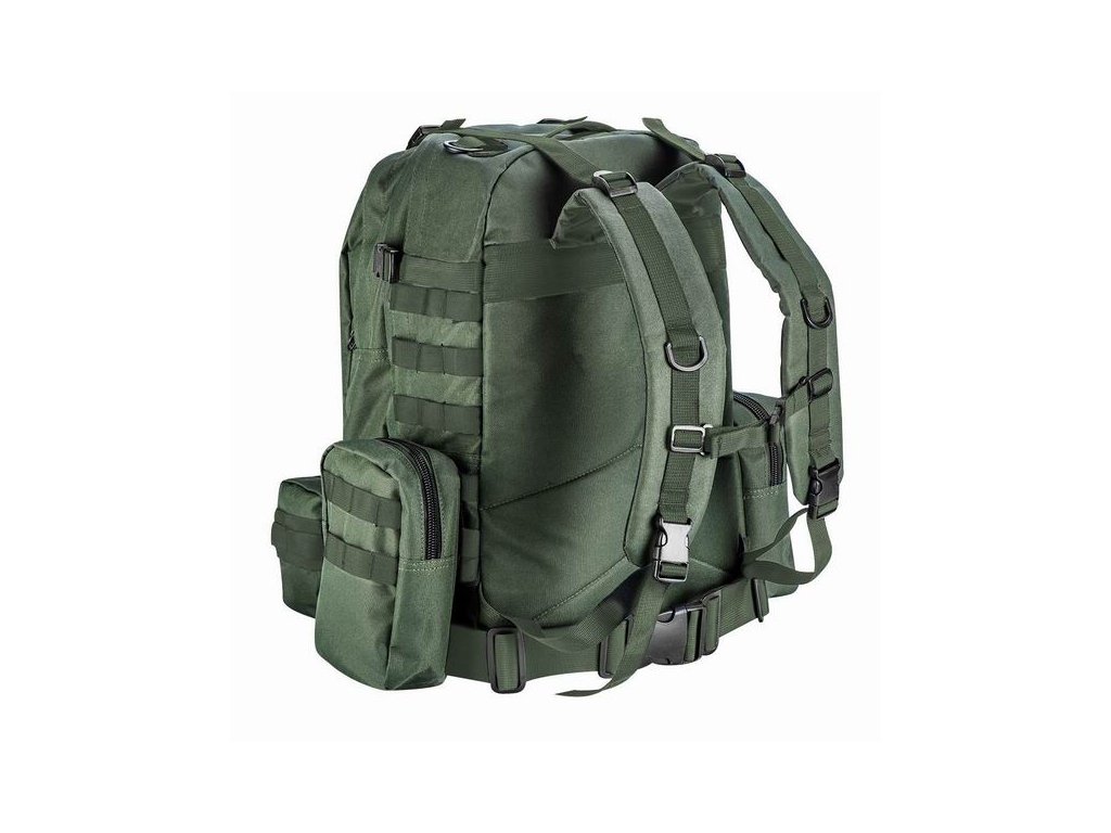 Pohodlný survival batoh s prostornou hlavní kapsou určený pro všechny, kteří rádi tráví čas aktivně na cestách za přežitím. Batoh pojme a zajistí náklad 40 l. Pro pohodlí při skladování jsou do něj umístěny další tašky: dvě malé boční tašky a jedna střední taška. Tašky lze odepnout a střední taška má přídavný ramenní popruh. Batoh se díky svému designu extrémně pohodlně používá. Má nastavitelné ramenní popruhy, nastavitelný hrudní a bederní pás a také boční a horní lemy.