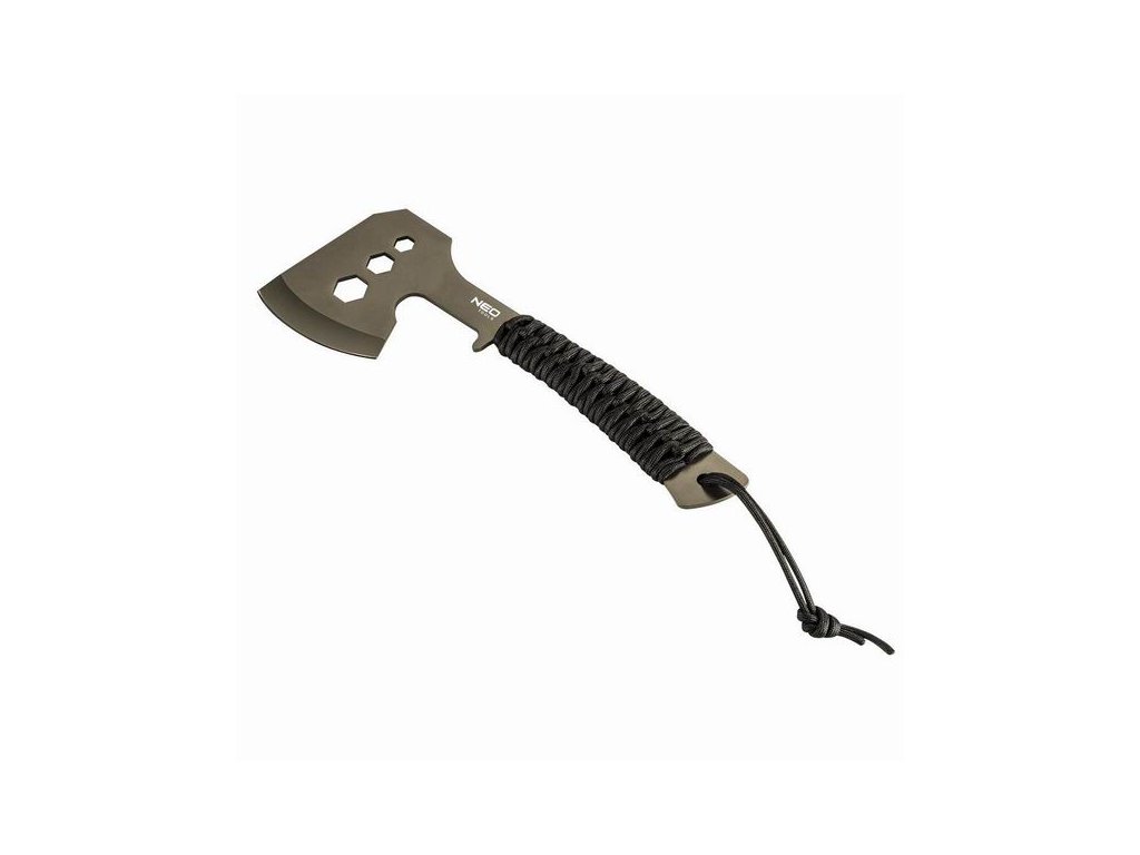 NEO multifunkční sekera 63-118 o celkové délce 26 cm a ostří 8 cm je vyrobena z nerezové oceli a navíc potažena vrstvou saténu. Rukojeť tvoří paracordové lano, které lze v případě potřeby využít. Čepel má otvory pro povolování šroubů M10, M13 a M16. Sada obsahuje nylonové pouzdro.