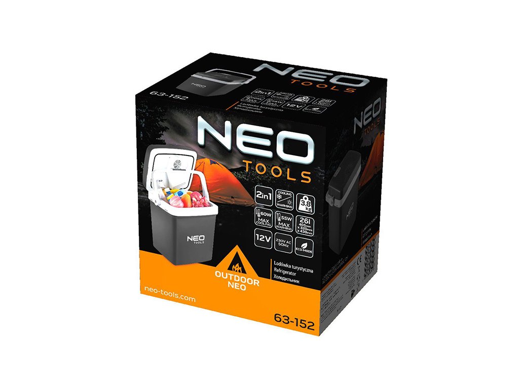 Cestovní chladnička 63-152 od NEO je spotřebič 2 v 1, který umožňuje jak ohřev (až do 55 W), tak chlazení (až do 60 W) skladovaných produktů. Má kapacitu 26 litrů a rozměry: 405 x 320 x 430 mm. Vybaven systémem eco-mode patří do kategorie ekologických a moderních spotřebičů. Chladnička funguje na 230 V a 12 V. Součástí jsou dva vyhrazené kabely, stejně jako napájecí kabel HO3VVH2-F. Jednotka je vybavena praktickým elektronickým ovládacím panelem a USB portem. Rukojeť připevněná k tělu usnadňuje přenášení a přepravu chladničky. Doporučuje se pro všechna roční období, na výlety mimo město i na dovolenou.