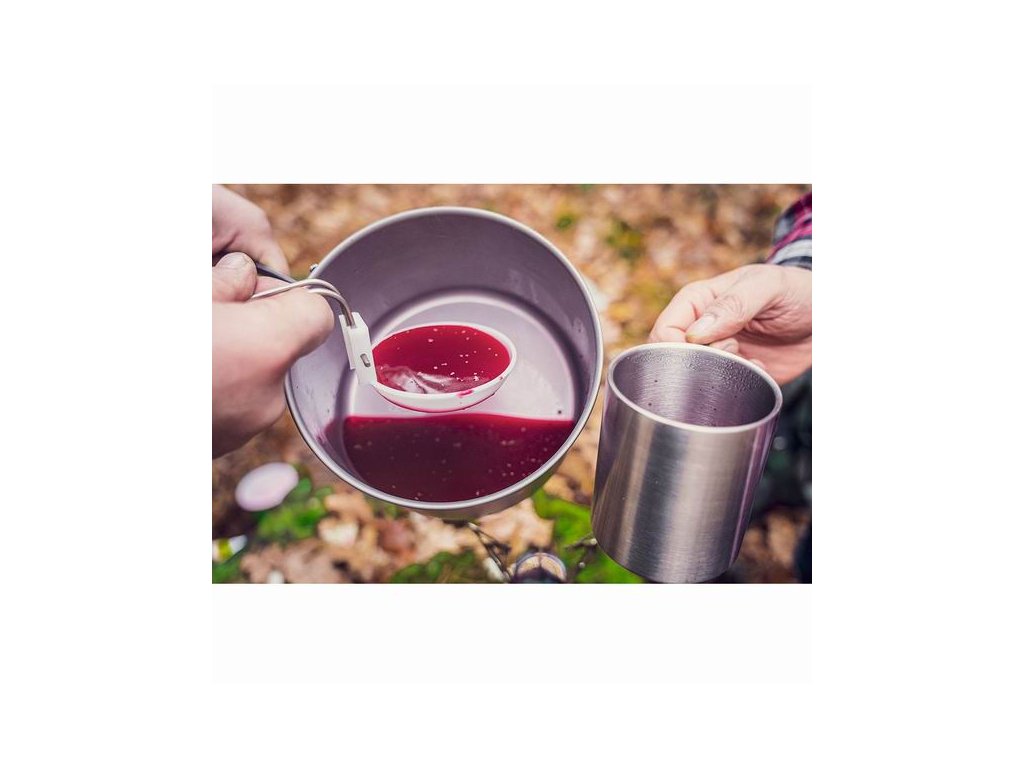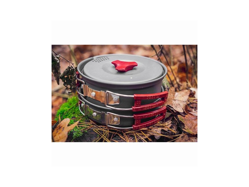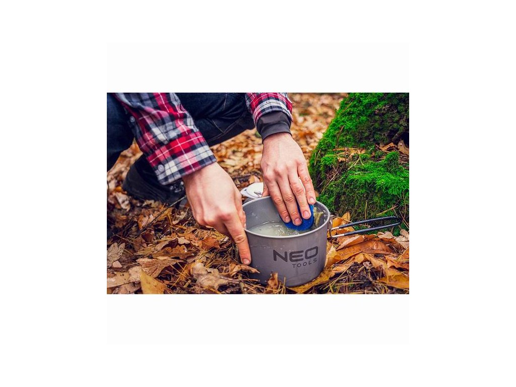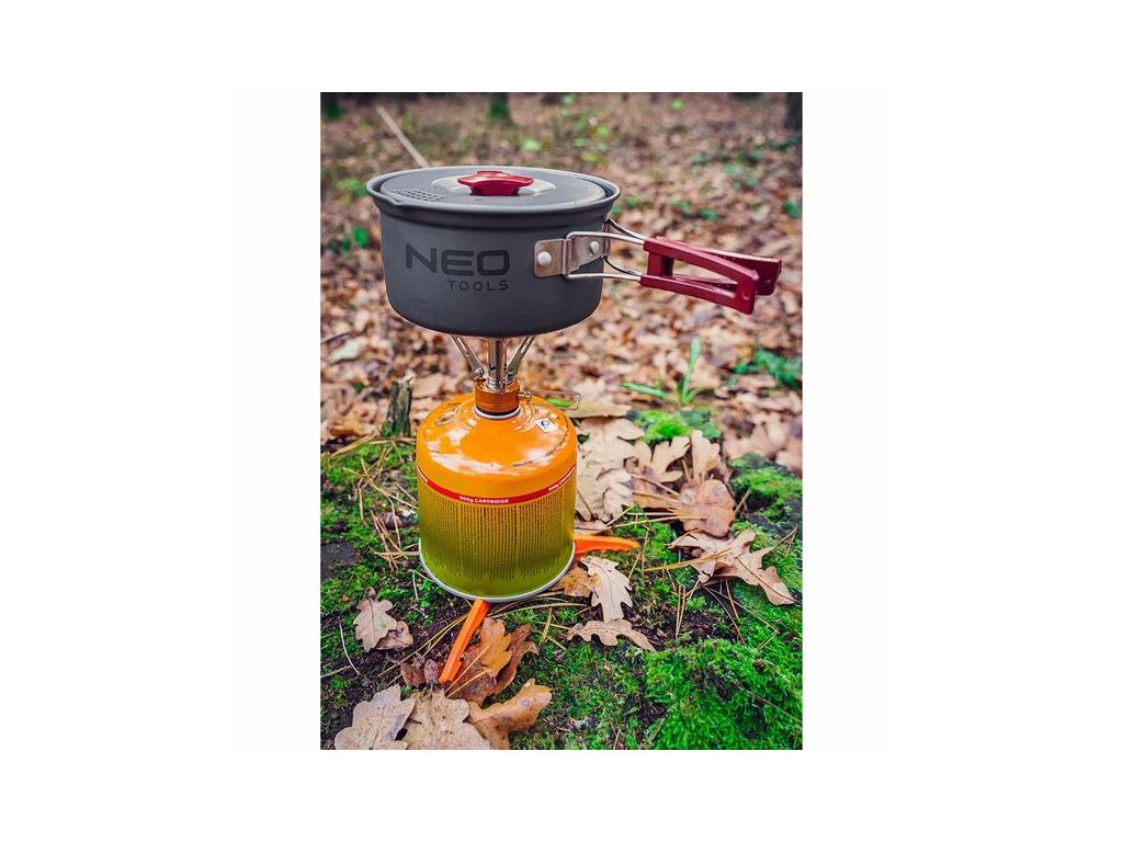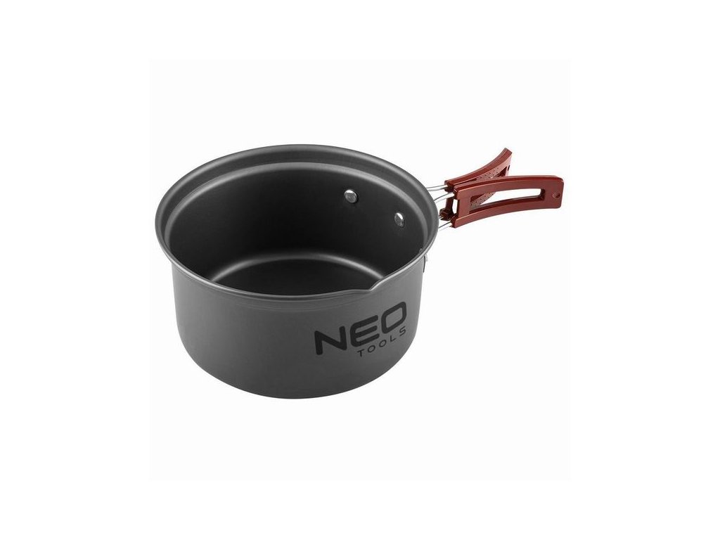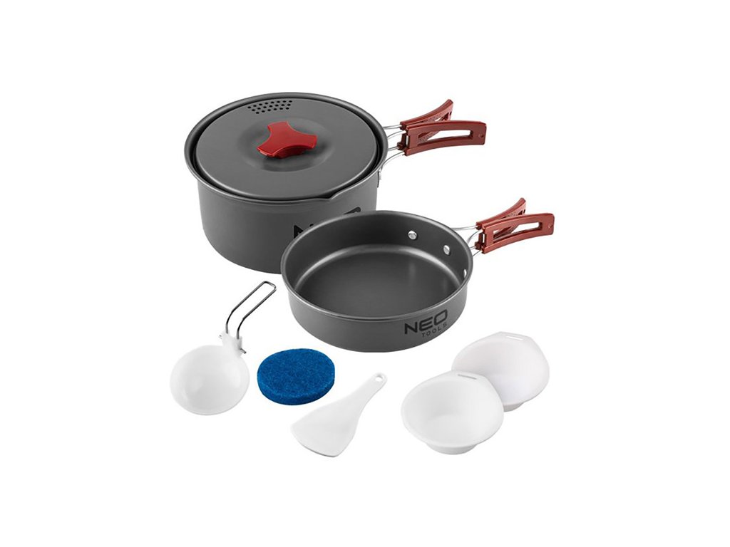Praktická sada turistického nádobí 7v1 od značky NEO, která se skládá z hrnce o objemu 1 l, pánve 0,6 l, 2x talíře, naběračky, stěrky a houbičky. Jedná se o sadu pro vaření vody a přípravu pokrmů v polních podmínkách. Byl vyroben z odolného a lehkého eloxovaného hliníku (hrnec a pánev) a odolného plastu (talíře, naběračka a špachtle). Hmotnost celé sady je pouhých 420 g.