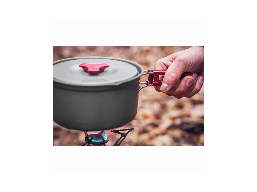 Nádobí má sklopné, izolované rukojeti a vyznačuje se také platným certifikátem schválení LFGB pro styk s potravinami. Sada obsahuje hrnec o průměru 150 mm a výšce 75 mm a pánev o průměru 155 mm a výšce 37 mm. Sada je nabízena s praktickou přepravní taškou.