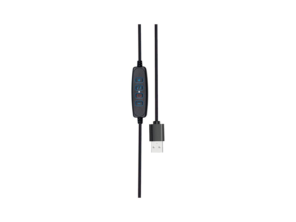 Dálkové ovládání je umístěno na 2 m dlouhém kabelu zakončeném USB konektorem, který světlo napájí. Pro napájení tak můžete použít notebook, powerbanku nebo jakékoliv zařízení s USB portem. Pomocí dálkového ovladače světlo zapínáte / vypínáte, nastavujete teplotu barvy nebo upravujete jas. průměr kruhu: 13" (33 cm)