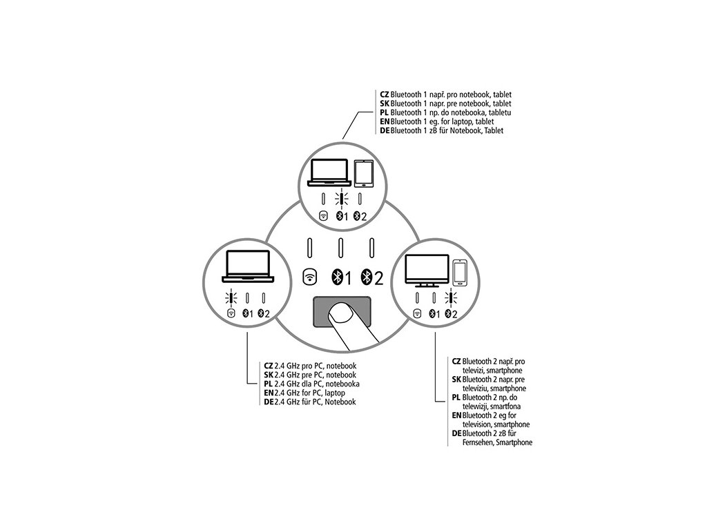 Klávesnice nabízí hned tři možnosti připojení současně. První z nich je bezdrátový 2.4 GHz přijímač, který nejlépe využijete pro připojení k počítači nebo notebooku. Další dvě možnosti nabízí spárování s různými zařízeními přes Bluetooth 3.0. Můžete tak klávesnici připojit také ke smartphonu, tabletu, televizi nebo dalšímu notebooku. A co je na tom úplně super? Že se mezi jednotlivými připojenými zařízeními přepínáte pouhým stiskem klávesy. Tak snadné to je. Klávesnice má navíc paměťovou funkci. Pokud používáte např. kanál Bluetooth 1 a klávesnici vypnete, po zapnutí se opět připojí k zařízení, které je spárováno v kanálu Bluetooth 1.