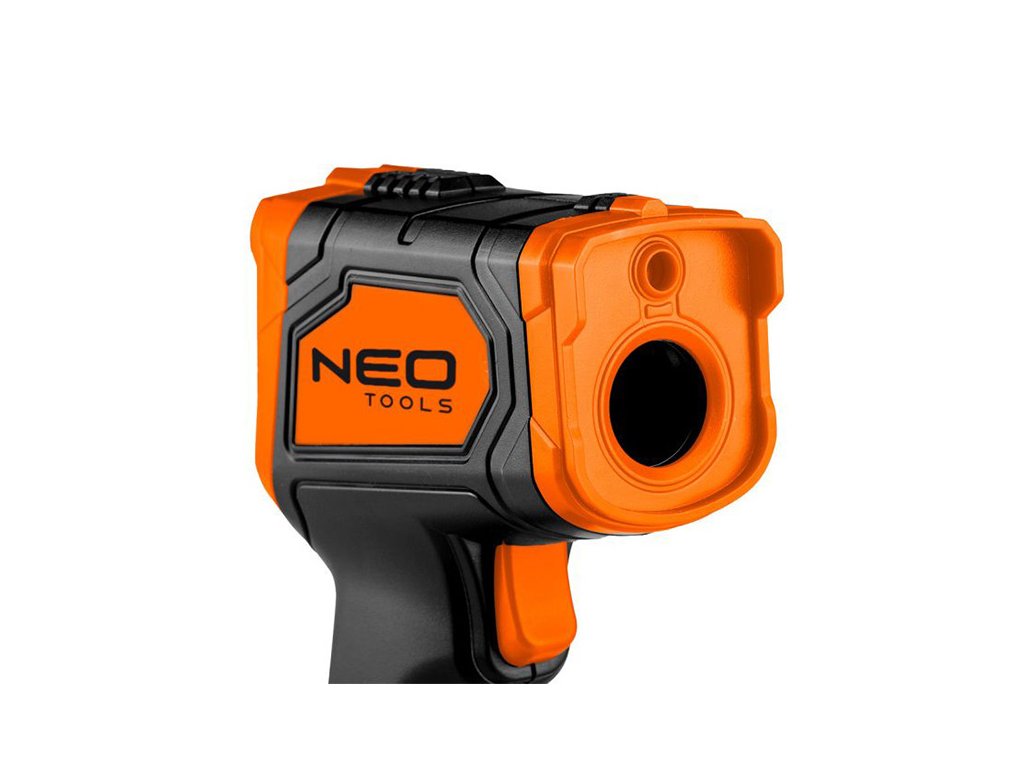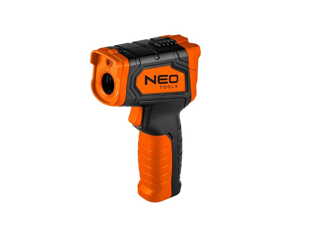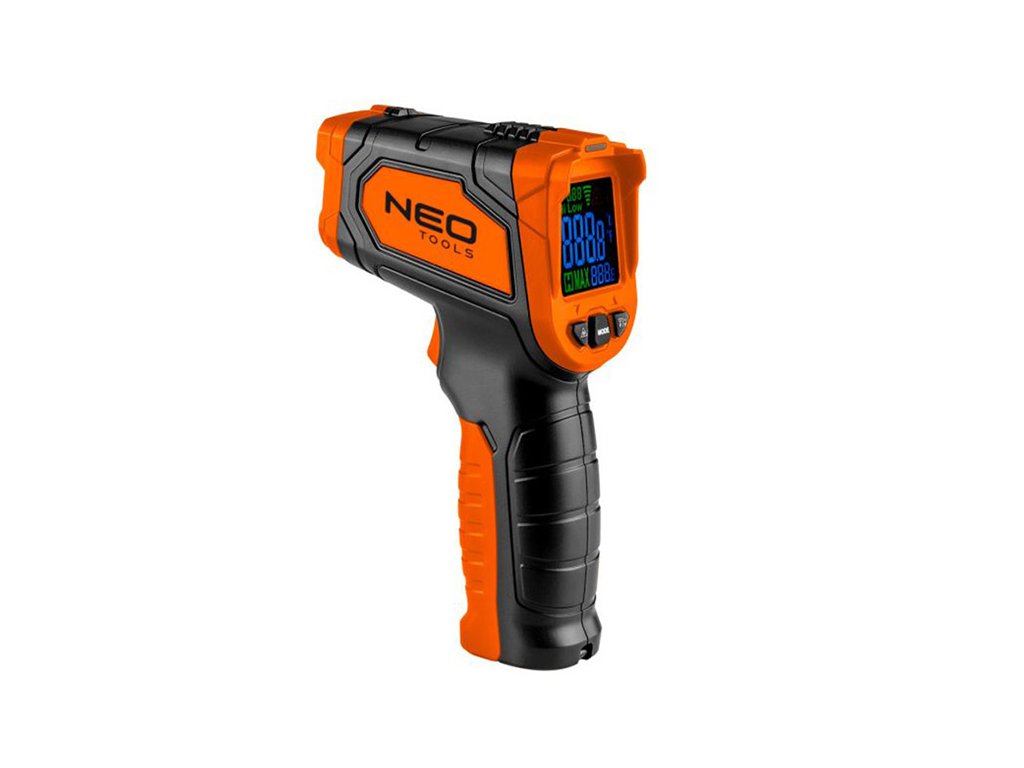 Pyrometr značky NEO má podsvícený displej a umožňuje provádět bezkontaktní měření. Můžete si vybrat mezi stupni Celsia a Fahrenheita. Vyznačuje se stupněm krytí IP54. Je napájen dvěma 1,5V AAA bateriemi, které jsou součástí balení. Toto je profesionální zařízení doporučené pro profesionály. Není to zdravotnická pomůcka.