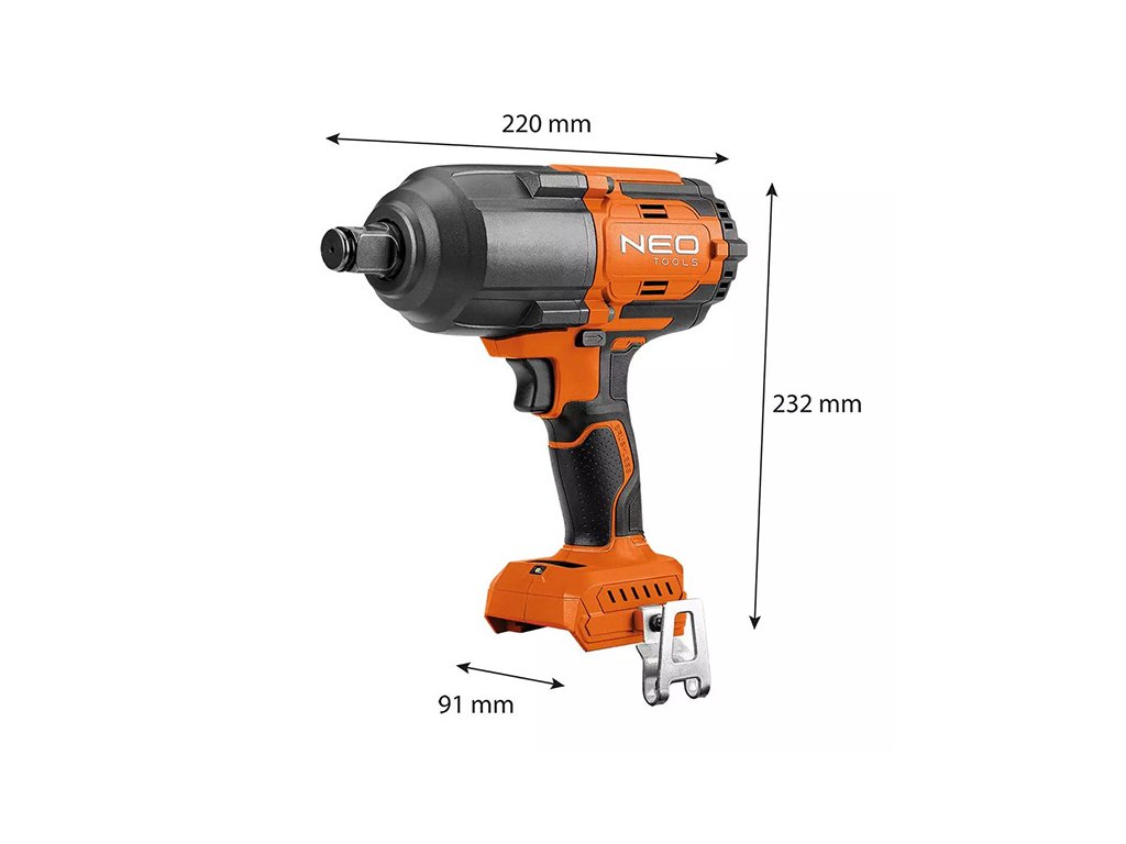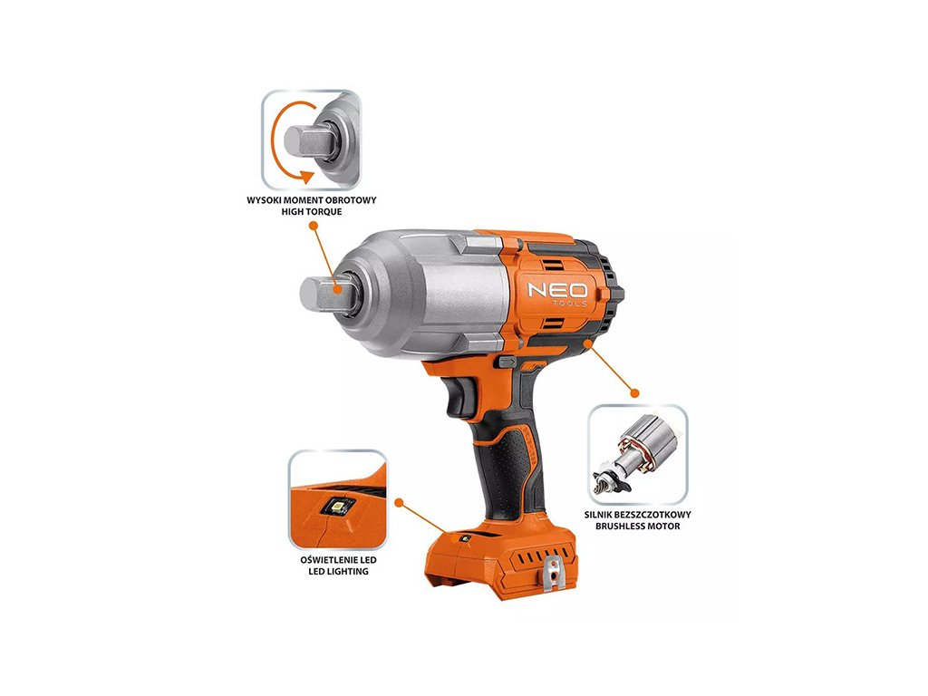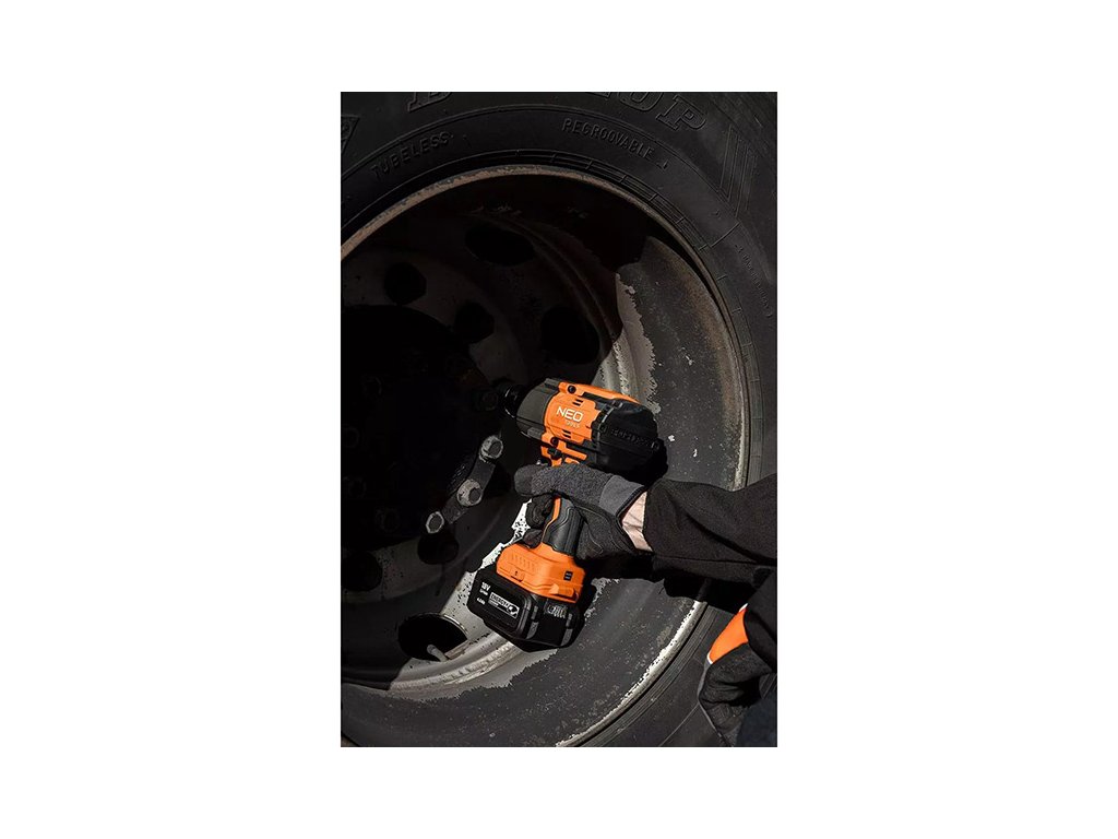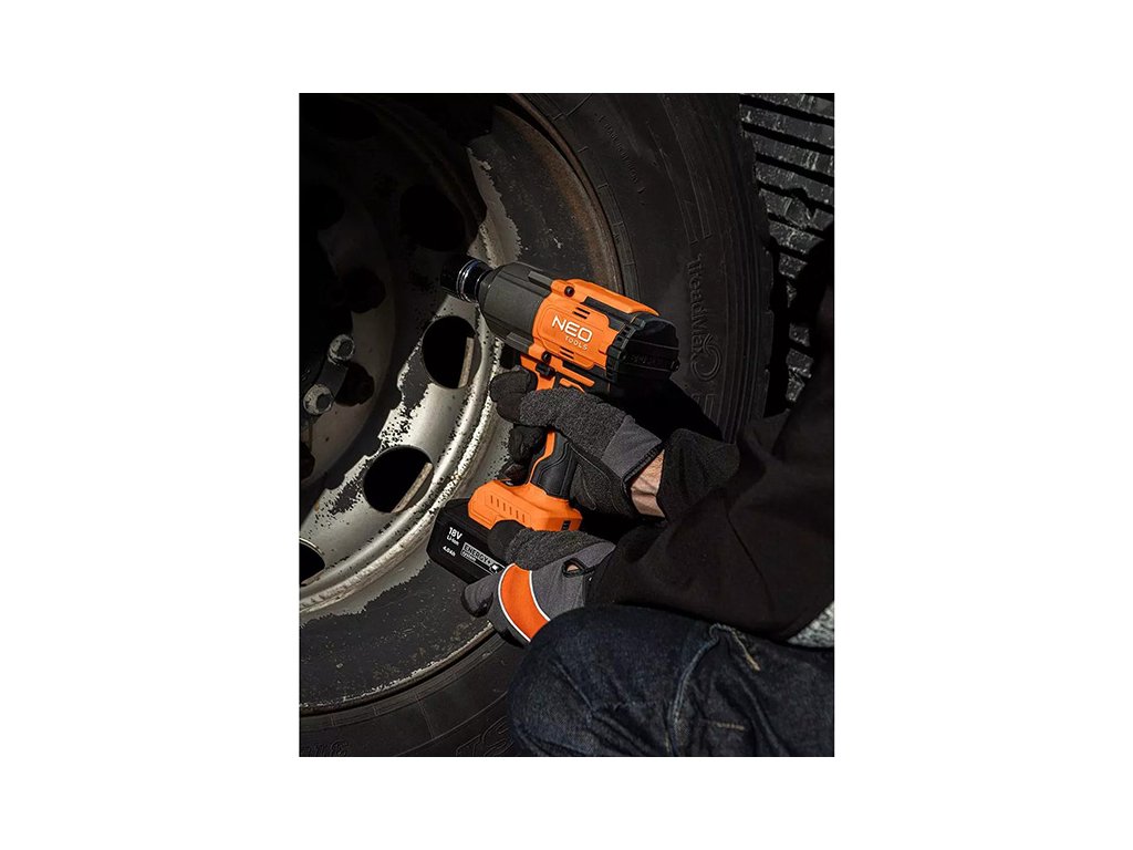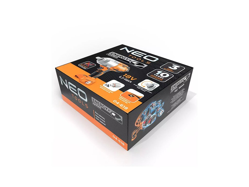 Bezkartáčový rázový utahovák značky NEO vyznačující se rychlostí až 1800 otáček za minutu a maximálním točivým momentem 1100 Nm. Funguje v bateriovém systému Energy+ a je kompatibilní s lithium-iontovými bateriemi 18 V. Doporučená kapacita je 6 Ah.