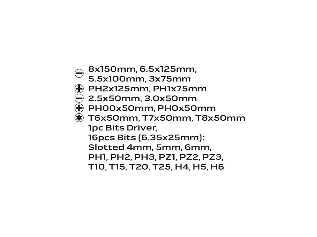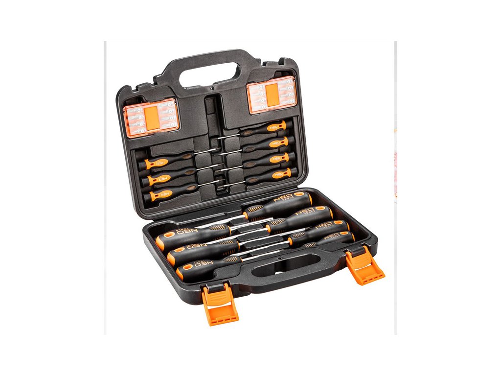 Sada NEO šroubováků a bitů (ref. č. 04-209) obsahuje 30 prvků nejvyšší kvality. Dřík šroubováku je vyroben z mimořádně odolné oceli S2, která poskytuje dlouhou životnost. Šroubováky mají magnetický hrot. Třílaločný tvar rukojeti s profilovanou opěrkou palce snižuje námahu ruky při práci a usnadňuje získání správného točivého momentu. Dvoumateriálová rukojeť zabraňuje sklouznutí v ruce, je také odolná vůči chemikáliím, olejům a tukům. Kvalita nářadí potvrzená 25letou zárukou výrobce. To vše spolu s 8 přesnými šroubováky nejvyšší kvality a 16 bity různých tvarů a velikostí, uzavřených v praktickém pouzdře, což usnadňuje přepravu a skladování. Značka NEO splňuje očekávání profesionálů.