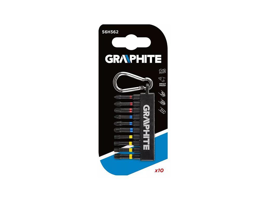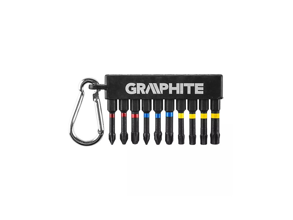 Sada rázových bitů GRAPHITE (ref. 56H562) obsahuje 10 bitů PH1/2/3, PZ1/2/3, TX25/27/30/40, celková délka 50 mm. Jedná se o odolné bity určené pro těžší práci s vysokým točivým momentem pomocí šroubováků nebo rázových utahováků. Vyrobeno z vysoce kvalitní oceli S2, která se vyznačuje zvýšenou pružností a odolností proti mechanickému poškození. Torzní zóna, rotující pod vlivem vysokého točivého momentu, snižuje přenos síly, díky čemuž je bit odolnější proti zlomení a jeho životnost se několikanásobně prodlužuje. Pracovní špička špičky zaručuje dokonalé přizpůsobení. Sada s karabinou pro připevnění na poutko na opasek. Značka GRAPHITE nabízí širokou škálu elektrického nářadí, které splňuje požadavky profesionálů.